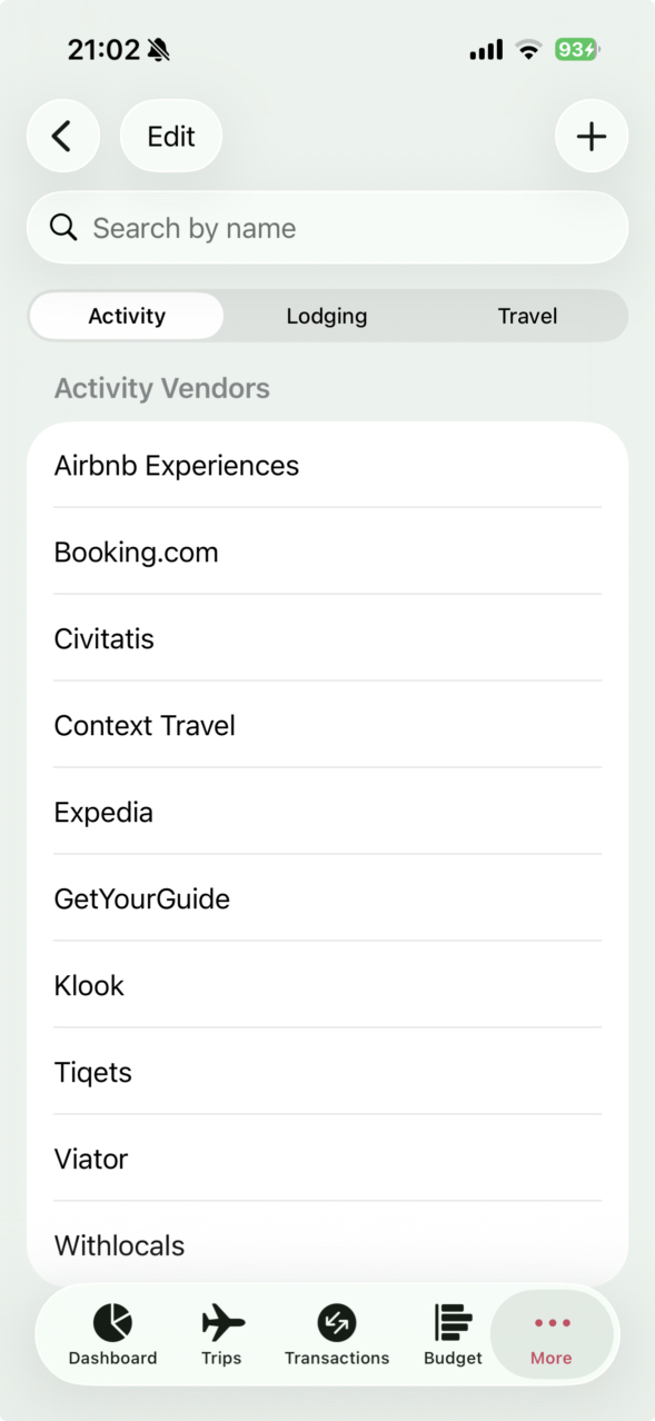 Voyage Vault adds several default vendors for activity, lodging, and travel reservations, but you can add, change, or delete them to customize your lists.